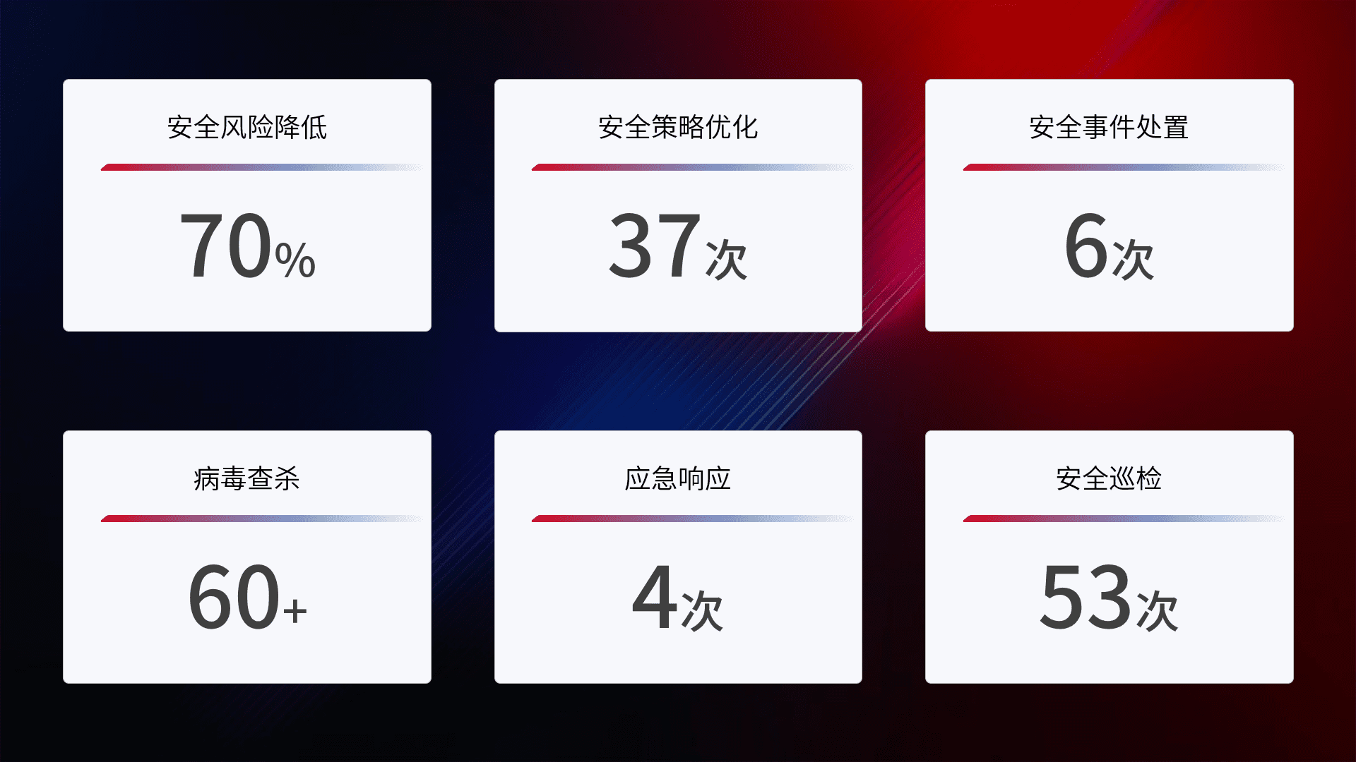 提供全面的安全事件报告体系,,,,包括处置报告、、、、周报、、、、季度和年度总结,,结合持续监控,,,帮助客户深入了解网络安全状况。。