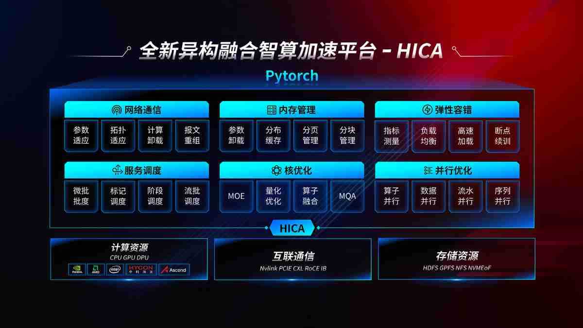 通过自研的服务层、、中间适配层、、、以及调度编排算法,,,,采用数据并行、、、、模型并行等多种并行方式,,,把并行计算任务进行有效的分解,,使其分别由相应的软件栈和算力资源来承接。。。。当GPU资源变化,,HICA可以实时动态调度计算子任务并调整模型拓扑和架构,,以充分聚合各种算力资源。。。