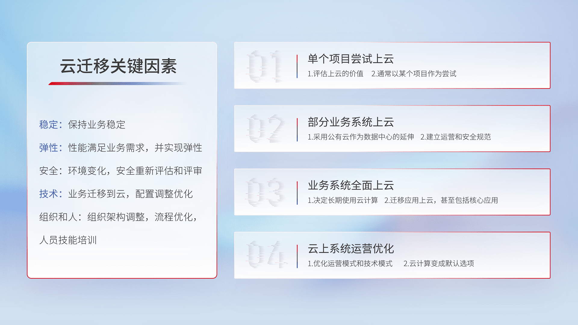 结合实际业务,,,,从规划设计、、、云平台选型、、、、云原生改造、、、数据迁移、、集成交付,,,,迁移全过程为客户识别最佳上云路径,,,,做好风险识别管理,,设计网络架构、、、身份权限、、、安全审计合规、、、、操作审计、、、、日志审计、、监控告警策略、、多站点容灾设计等,,对云上基础设施进行整体规划,,,提升IT治理水平,,,以满足弹性、、高可用、、、、高性能的需求。。。