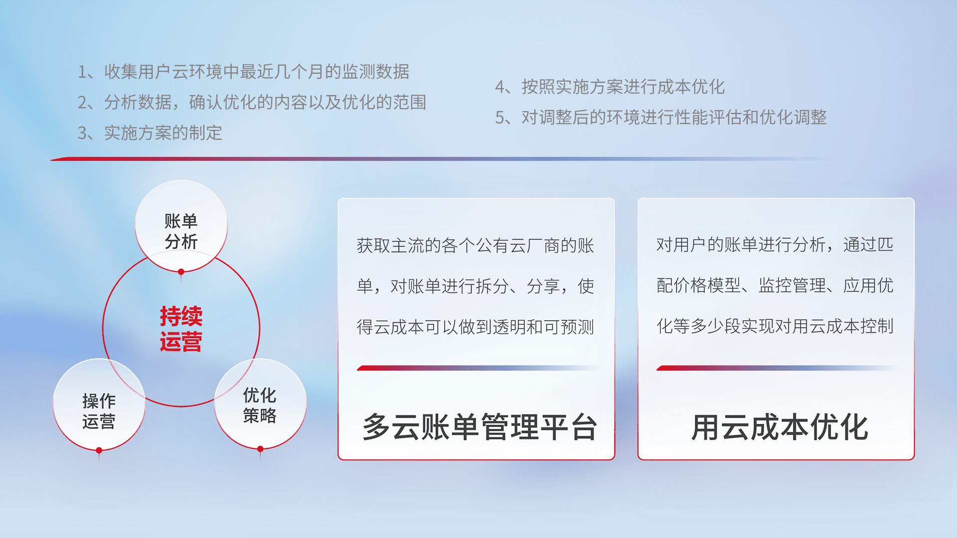通过多云纳管,,以统一的资源数据模型把客户的云资源进行抽象和封装,,,,进而实现对多云资源的统一操作,,,,保障云资源管理的可靠性、、、稳定性与可用性。。。。量身定制化运维内容,,,,配置、、、、开发运维、、、、补丁管理、、、备份、、、、监控、、、认证和访问管理、、审计和日常巡检等,,,保障在用云过程中的可靠度,,稳定度以及高可用率。。